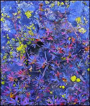 Autumn willow against boulder, Weminuche Wilderness, CO
